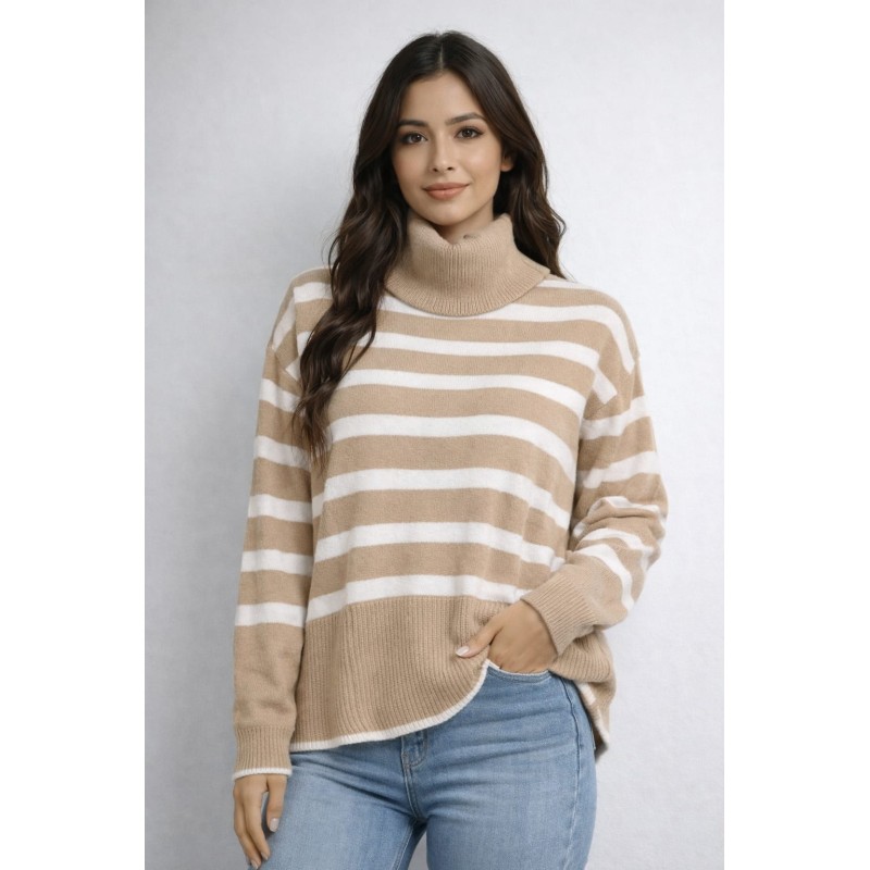 Jersey largo de punto suave y cálido, diseñado para aportar comodidad sin renunciar al estilo. Su diseño a rayas horizontales es un clásico renovado que nunca pasa de moda, mientras que el cuello vuelto amplio añade un toque moderno y envolvente, perfecto para los días más fríos.
