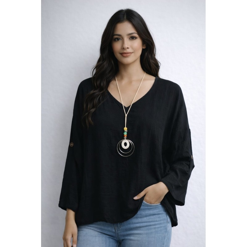 Blusa fluida de cuello en V y corte holgado,con mangas 3/4 ajustables. Tejido ligero y cómodo, ideal para un estilo elegante y casual,Talla unica equivalente 34 a 46