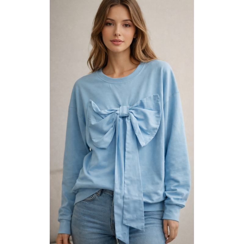 Sudadera azul con lazo frontal, confeccionada en tejido suave y cómodo. Diseño de cuello redondo, manga larga y corte recto, con un elegante lazo decorativo que aporta un toque femenino y original. Ideal para looks casuales con estilo,📏 Talla única equivalente a 36–42