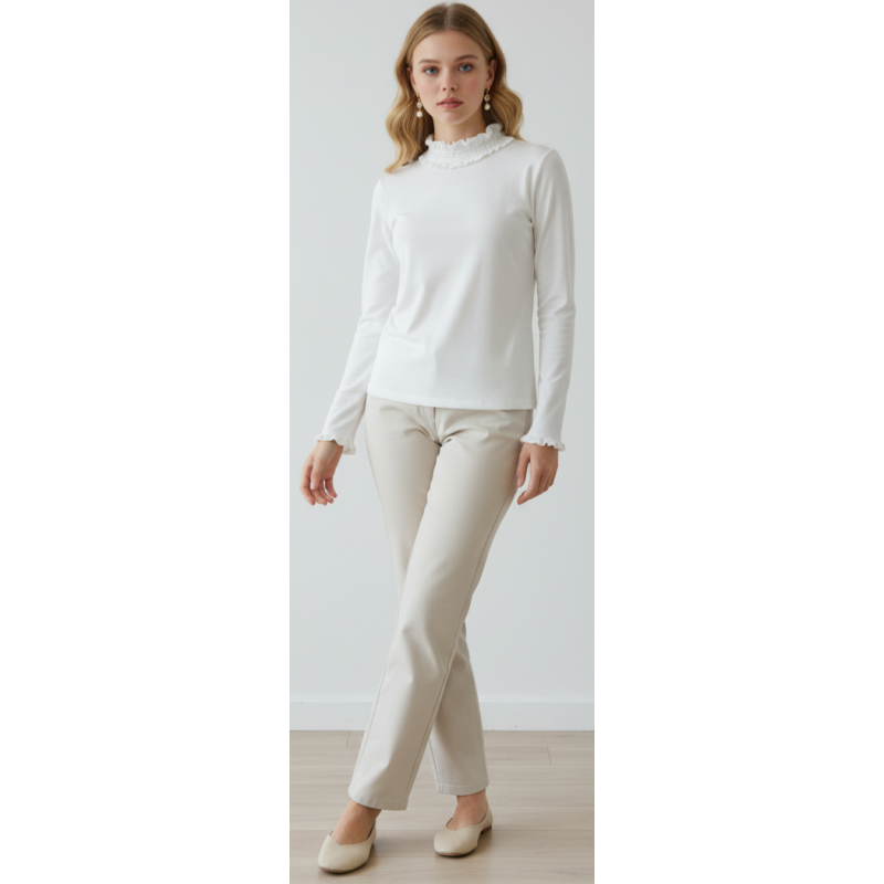 Camiseta de manga larga, cuello alto con un detalle fruncido, que se repite en los puños de las mangas para un toque elegante y femenino,Talla unica equivalente 34 a 40