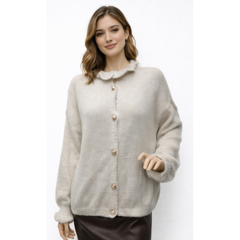 Cárdigan de punto grueso con cuello alto con volante.mangas largas abullonadas y puños fruncidos,Talla unica equivalente 34 a 46