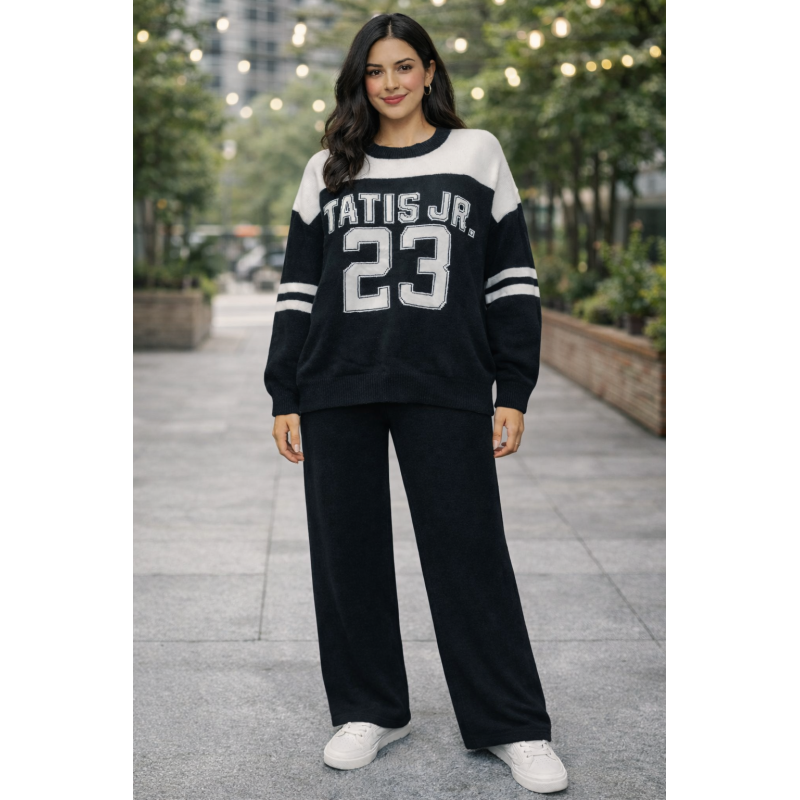 Conjunto de punto estilo varsity.Sudadera de punto con diseño universitario “TATIS JR 23” y pantalón ancho súper cómodo. Tejido suave, elástico y calentito: ideal para looks casuales y de diario con un toque deportivo,Talla unica equivalente 34 a 46