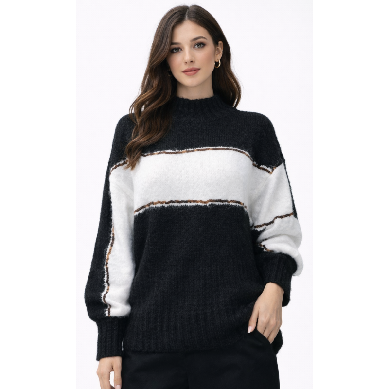 Diseño moderno con bloques de color y detalles de brillo en las uniones, creando un estilo llamativo y actual. Suave, calentito y perfecto para looks casuales de temporada.