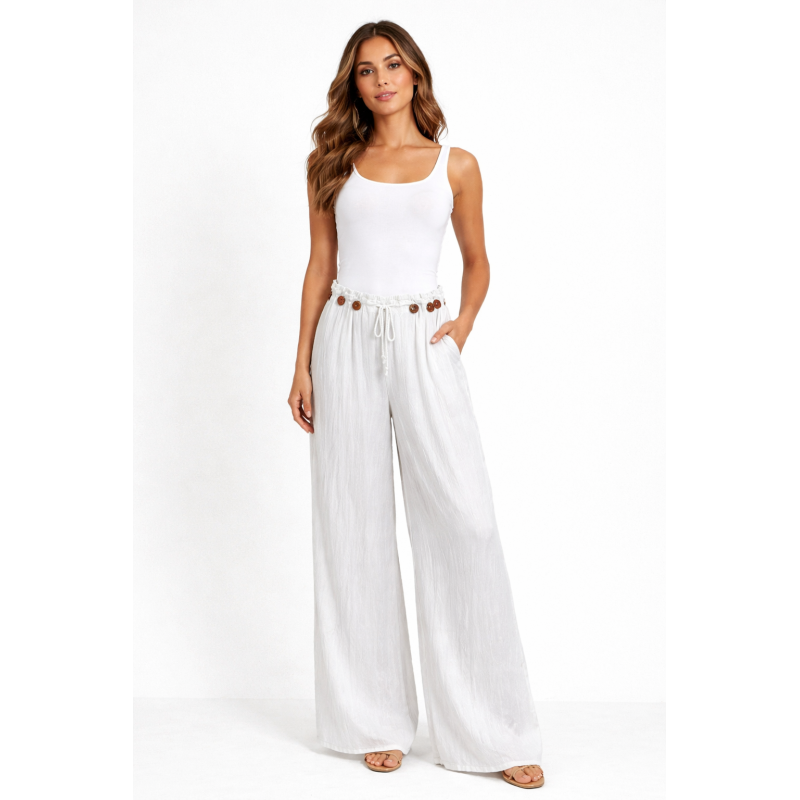 Pantalón tipo palazzo de corte amplio y caída fluida .