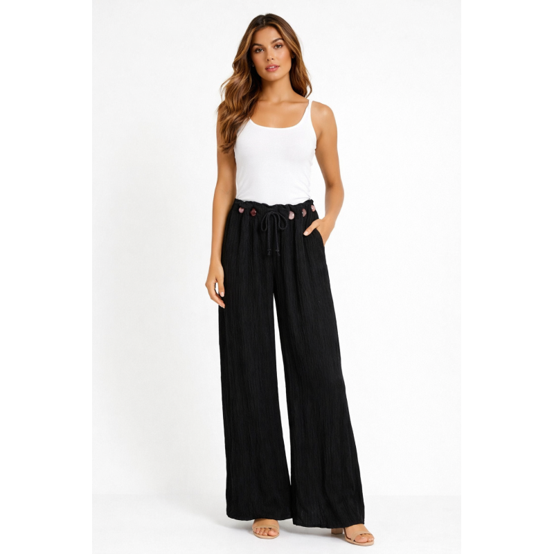 Pantalón tipo palazzo de corte amplio y caída fluida .