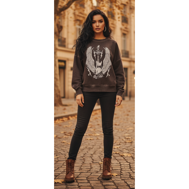 Sudadera con un gráfico central de una guitarra eléctrica con alas extendidas a cada lado,Talla unica equivalente 34 a 46