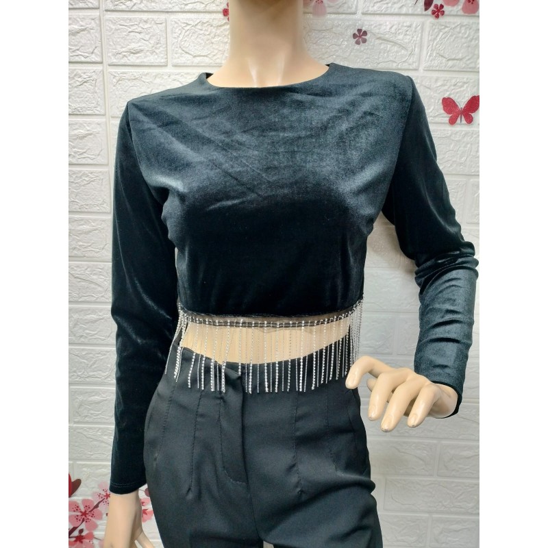 Top corto de terciopelo de manga larga con un detalle de flecos de pedrería plateada en la cintura,Talla unica equivalente 34 a 38
