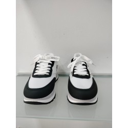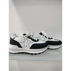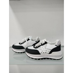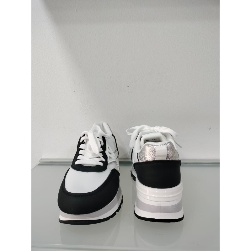 Zapatilla deportiva de diseño italiano, de color blanco y negro con detalles plateados.